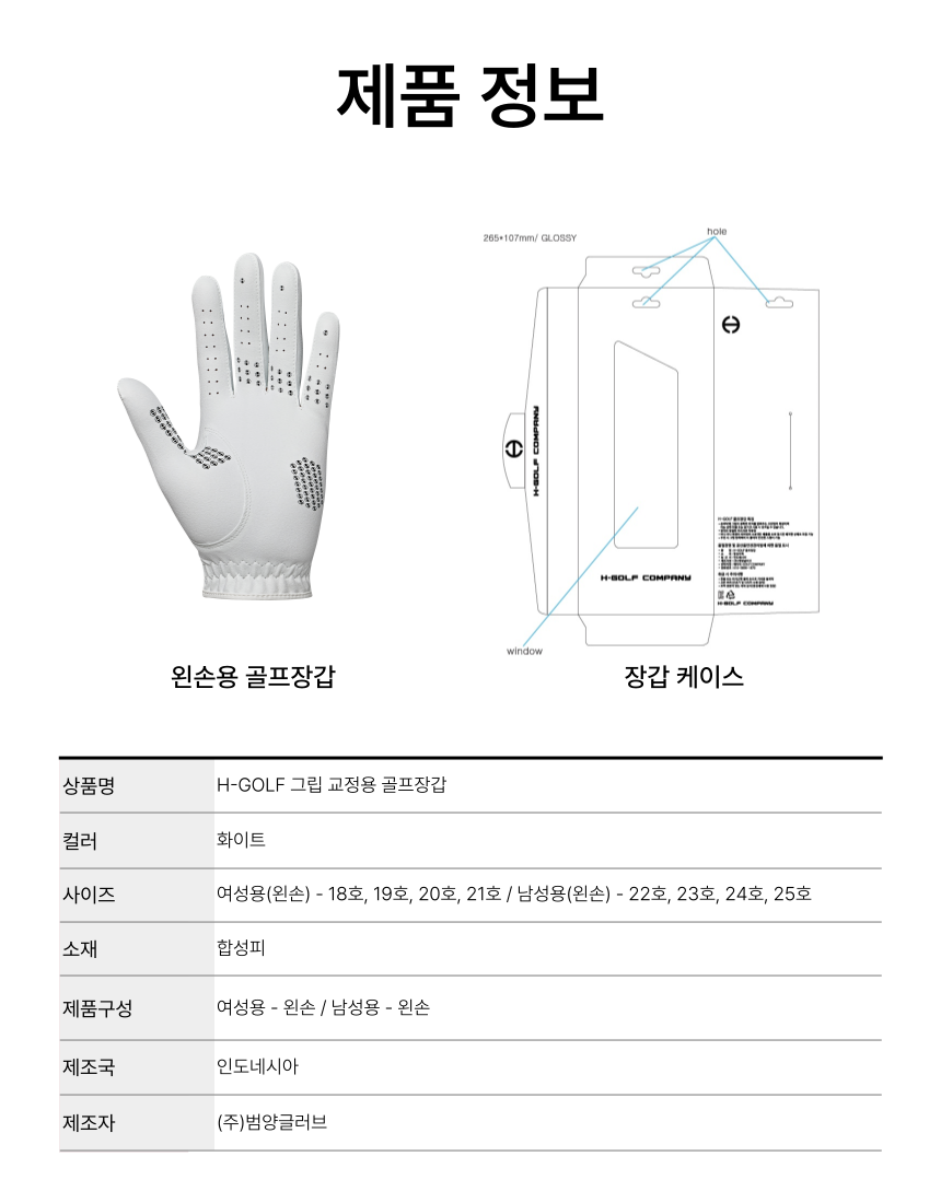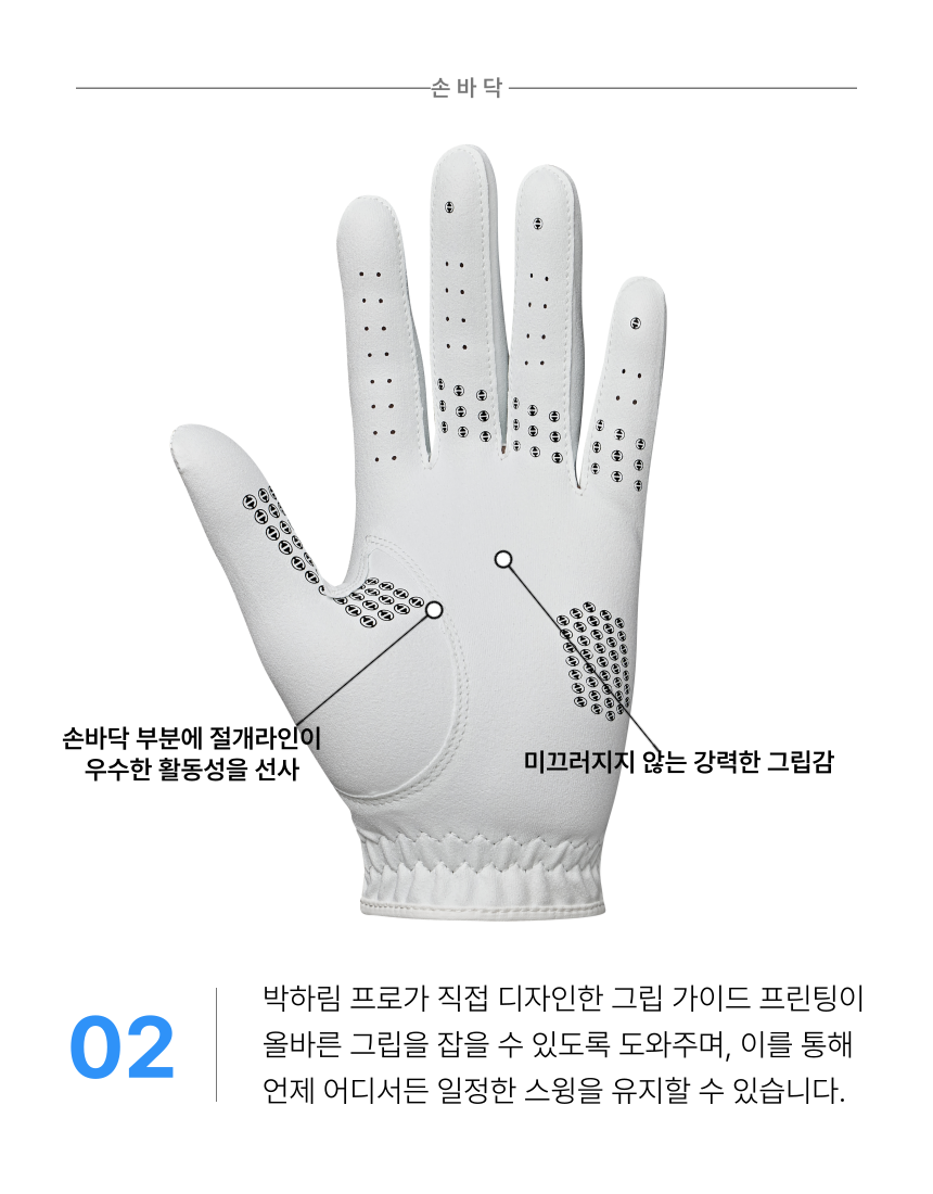 · 골프용 특수 극세사 원단으로 내구성이 강하고 미끄러지지않는 강력한 그립감과 손에 착 붙는 착용감이 특징