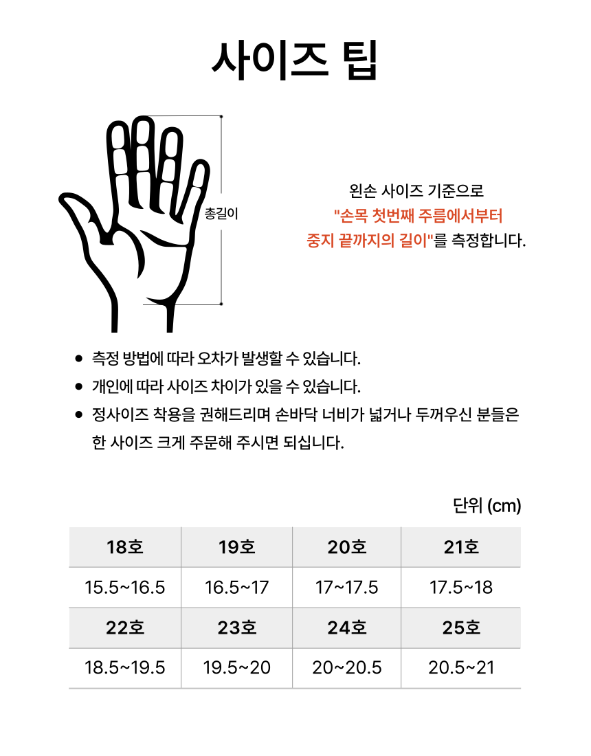 · 아래 사이즈 표에 따라 정사이즈 착용을 권해드리며 손바닥 너비가 넓으시거나 두꺼우신 분들은 한 사이즈 크게 주문해 주시면 되십니다.